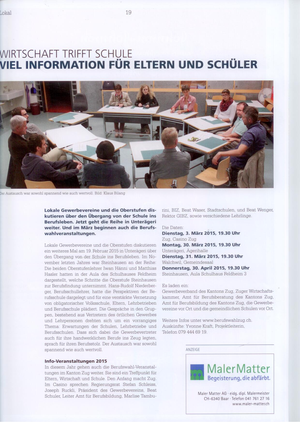 Wie können Schule und Gewerbe im Interesse der Jugendlichen sinnvoller zusammenarbeiten? Wie kann die Schule besser auf die Lehre vorbereiten? Diese grundsätzliche Fragen rund um die Berufswahlvorbereitung stehen im Zentrum der Veranstaltungsreihe des Gewerbeverbandes Zug «Wirtschaft trifft Schule».